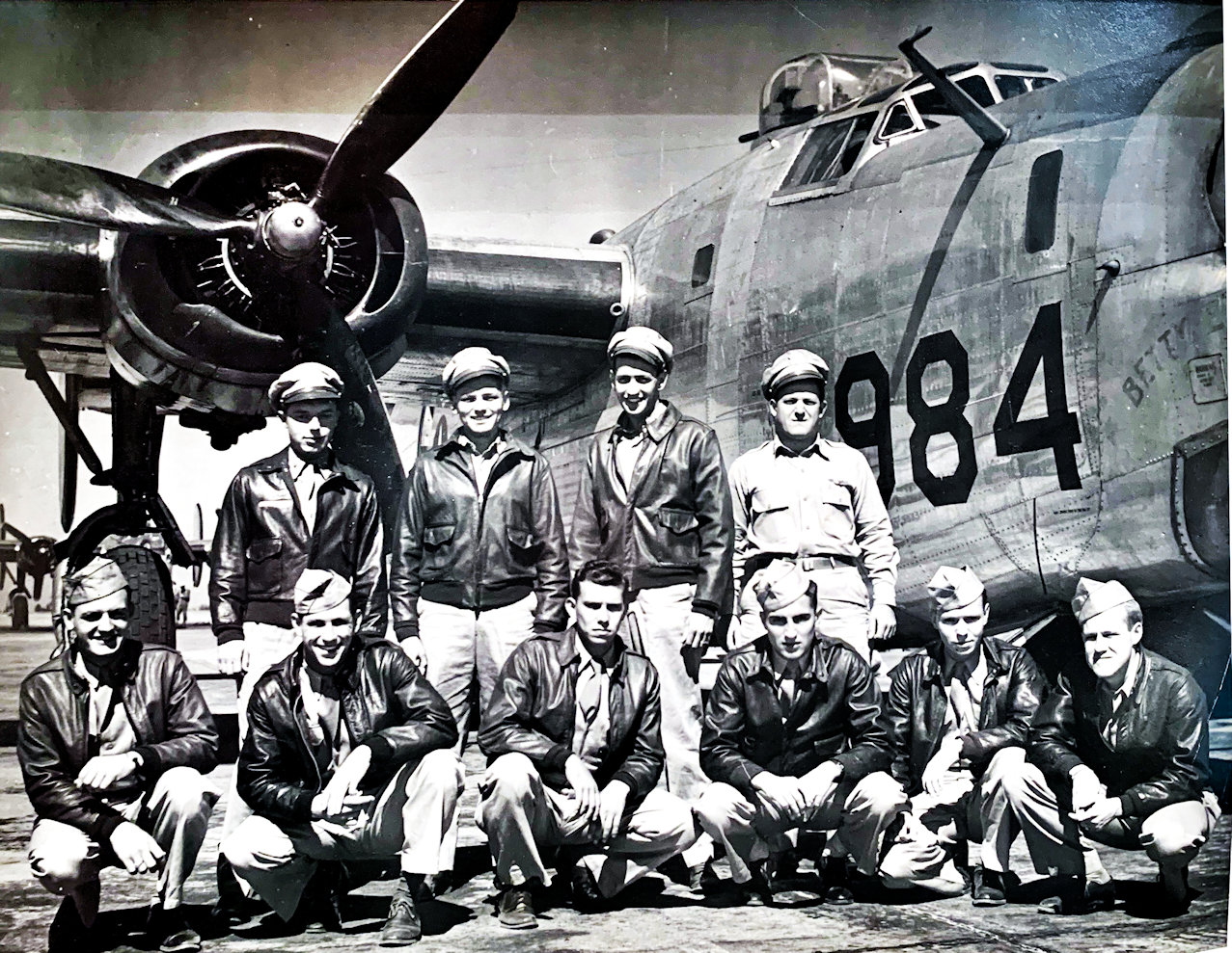 Marcel Fernand Millet squatting in front of the officer in the light jacket, B-24 Tail number 984 (c1944)