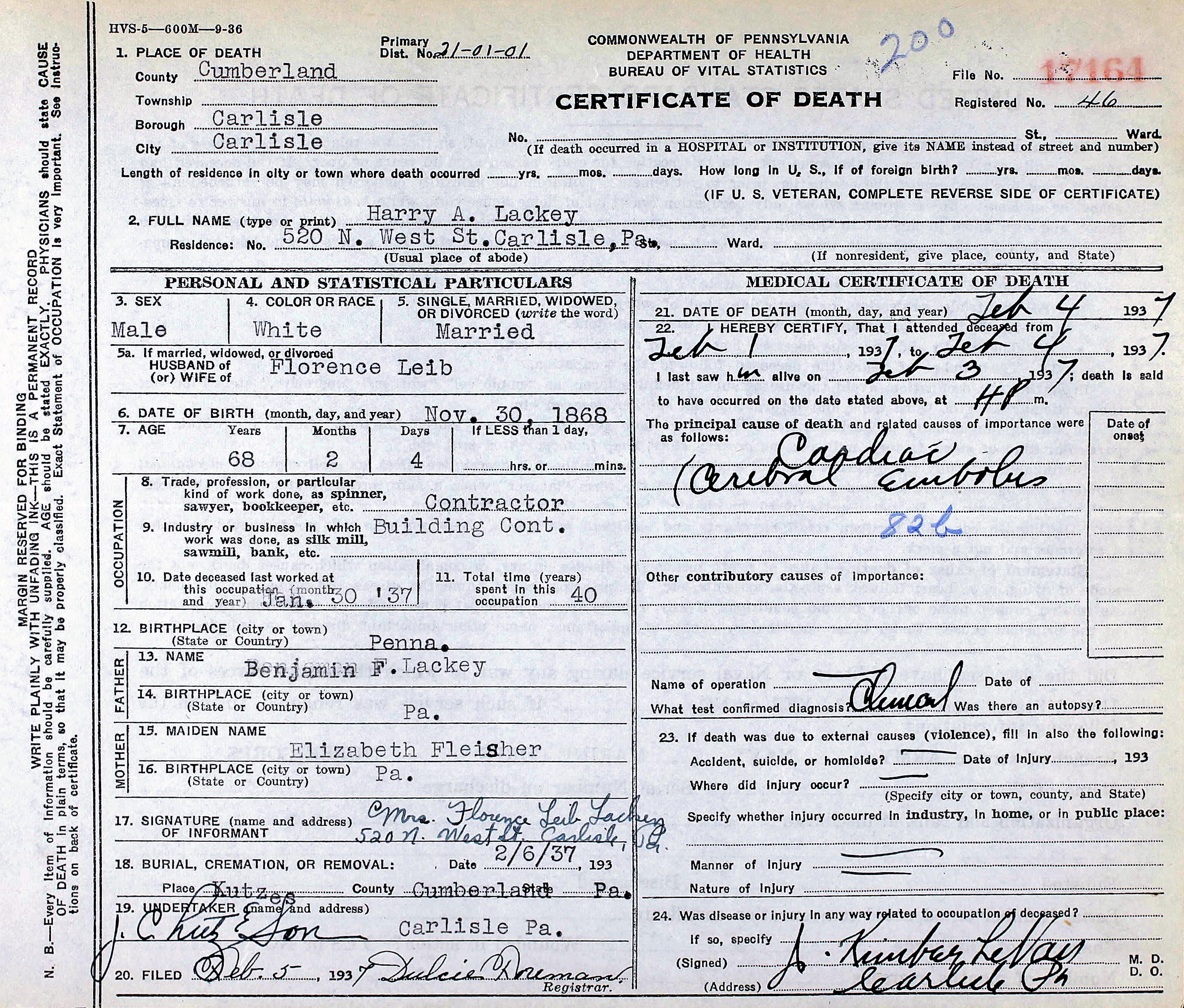 Harry Alfred Lackey (30-NOV-1868 - 04-FEB-1937) Death Certificate