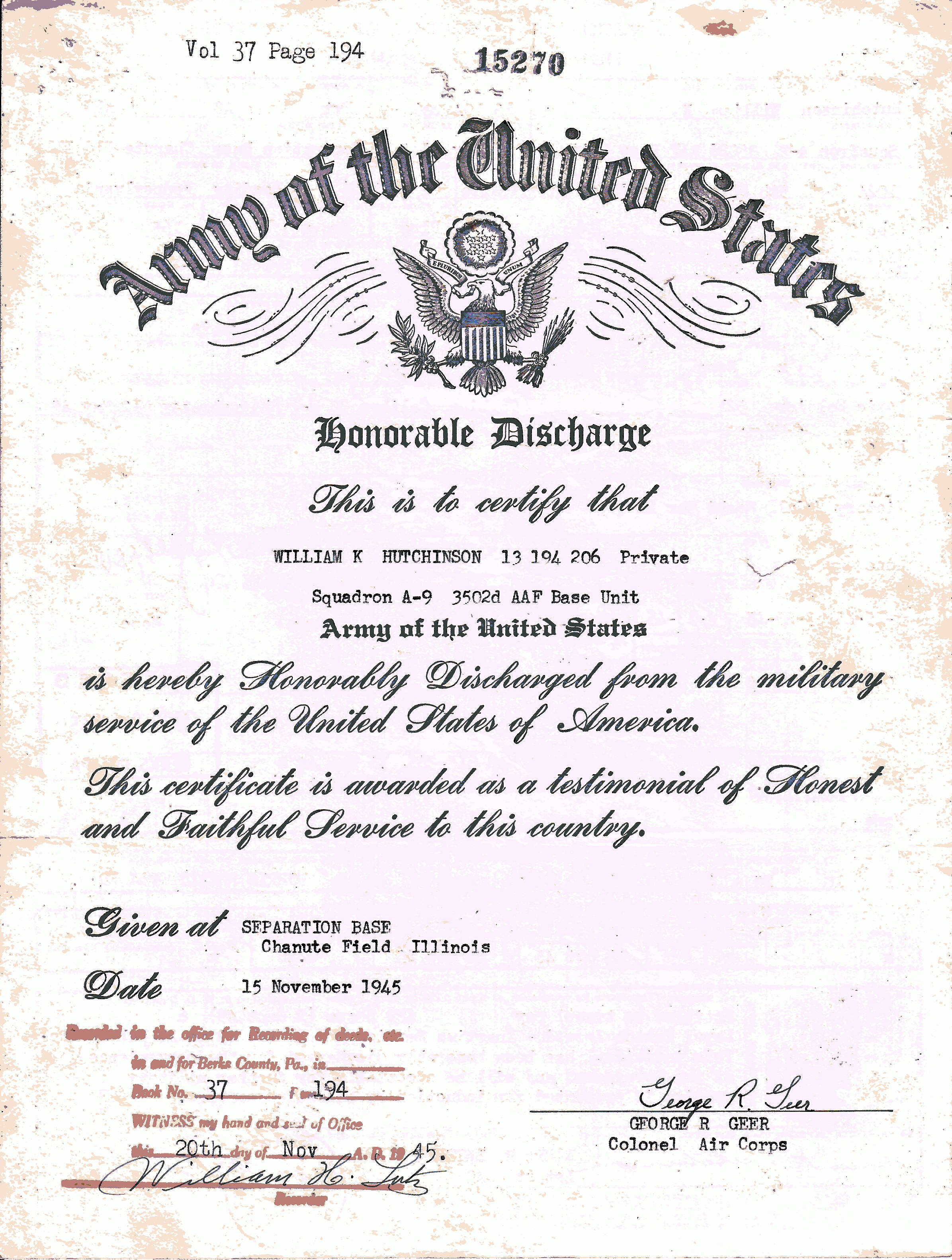 William K Hutchinson II WWII Honorable Discharge certificate (15-NOV-1945)