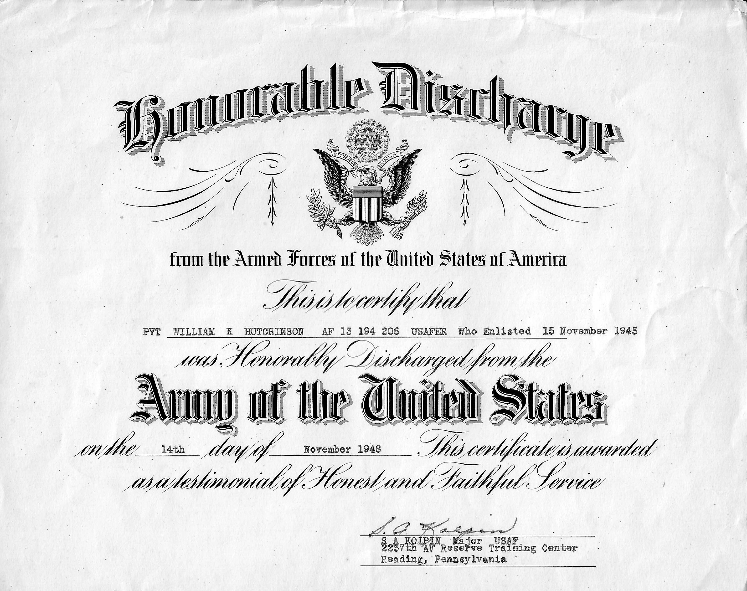 William K Hutchinson II Honorable Discharge 2237th Air Force Reserve Training Center (14-NOV-1948)