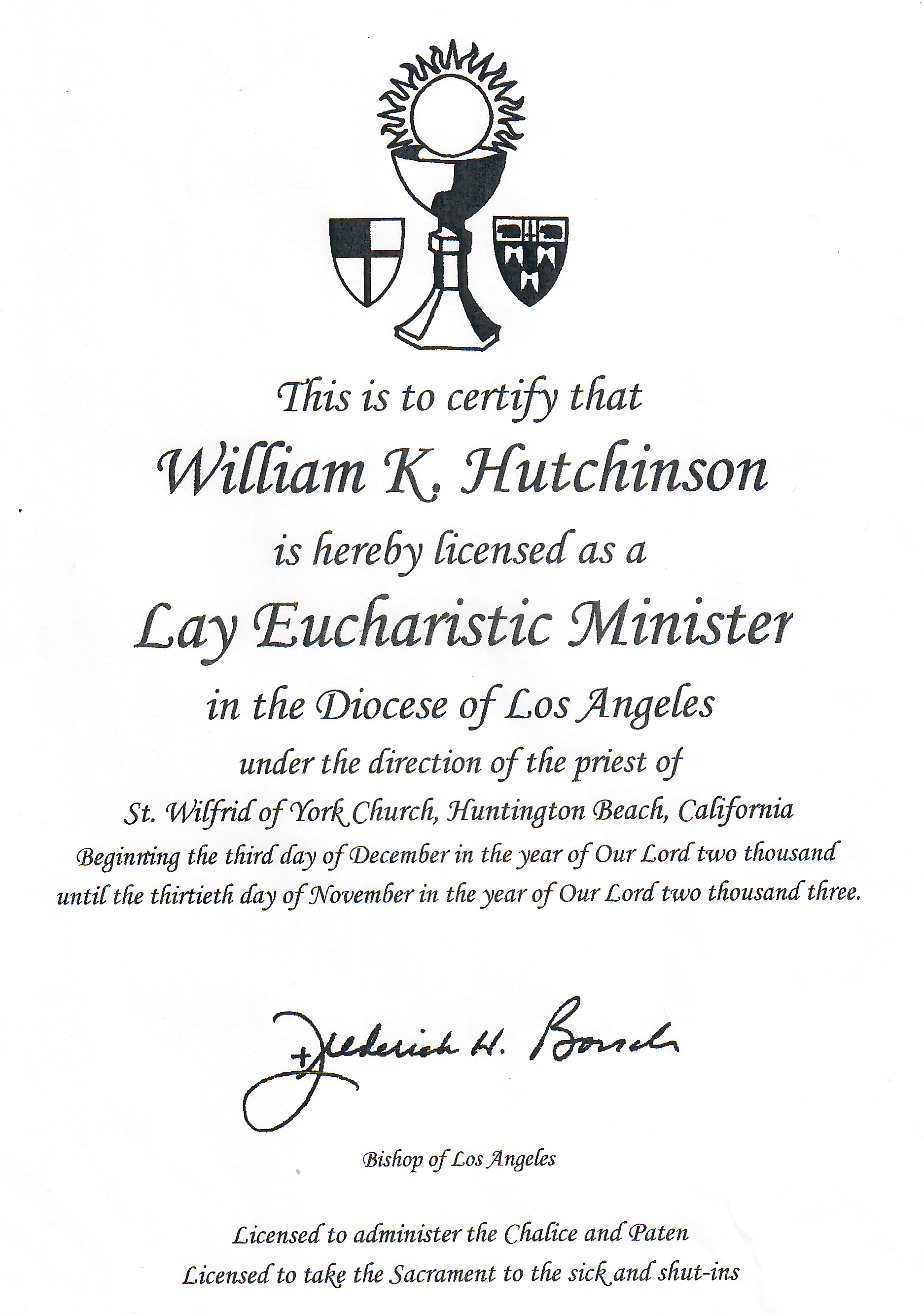 William K Hutchinson II Lay Readers licence front (03-DEC-2000)