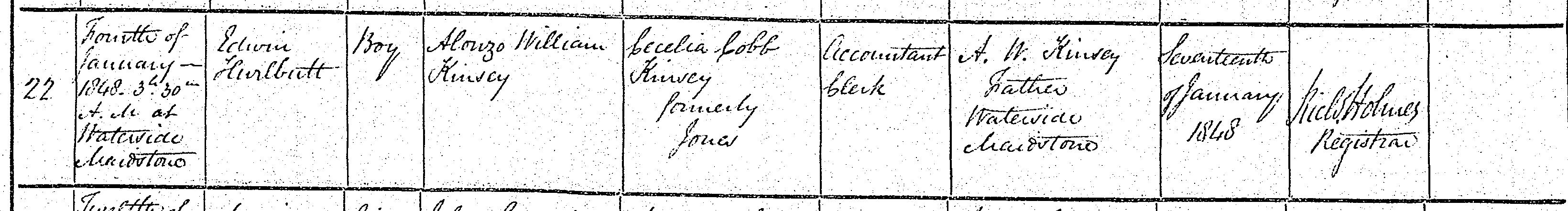 Edwin Hurlbutt Kinsey Birth Certificate 4-JAN-1848