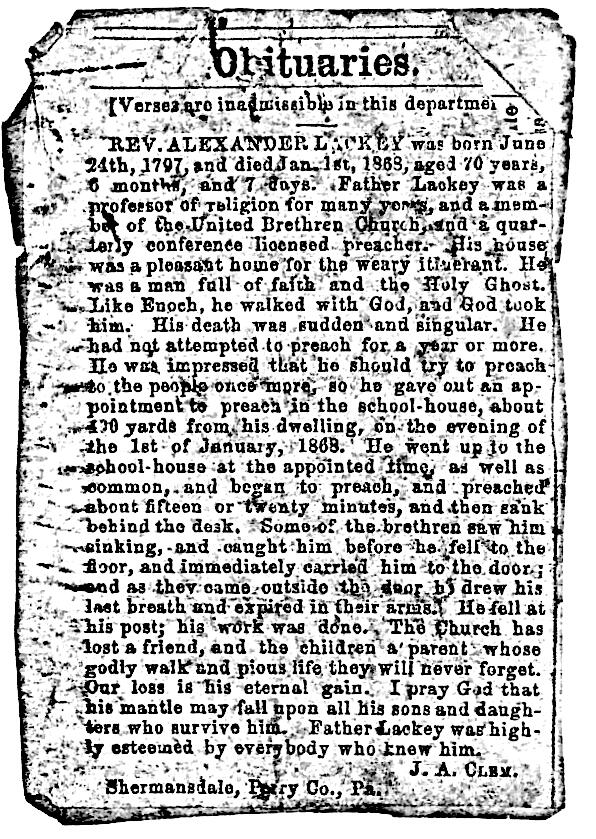 Rev. Alexander Lackey (1797-1868) Obit, Shermansdale, PA