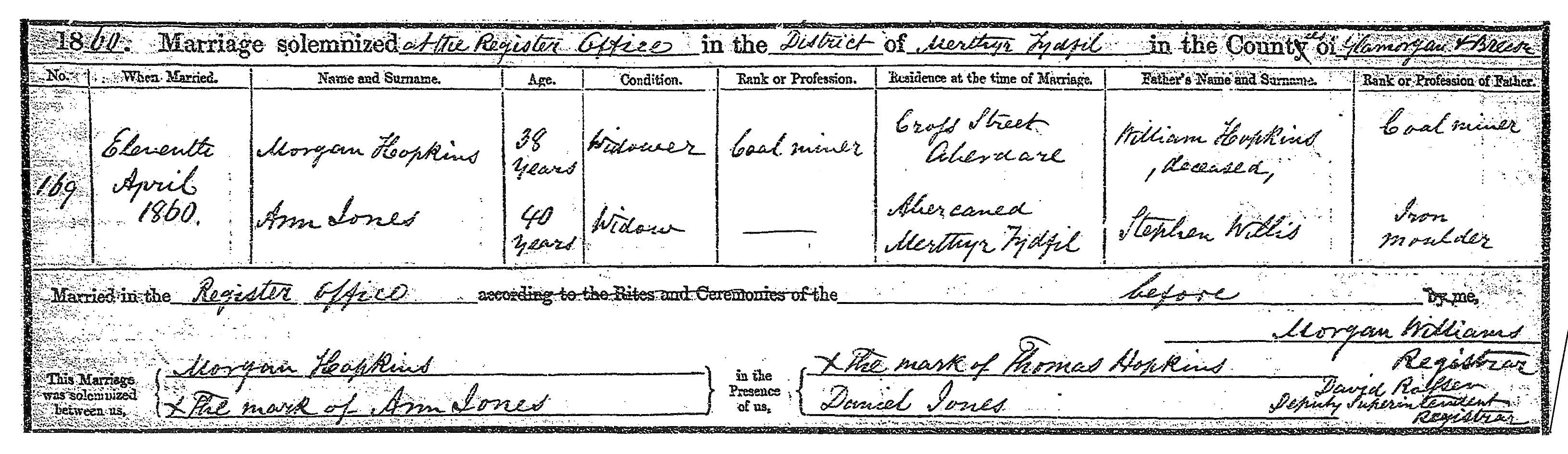 Ann Jones and Morgan Hopkins 11-APR-1860 marriage record depicts Ann's father as Stephen Willis