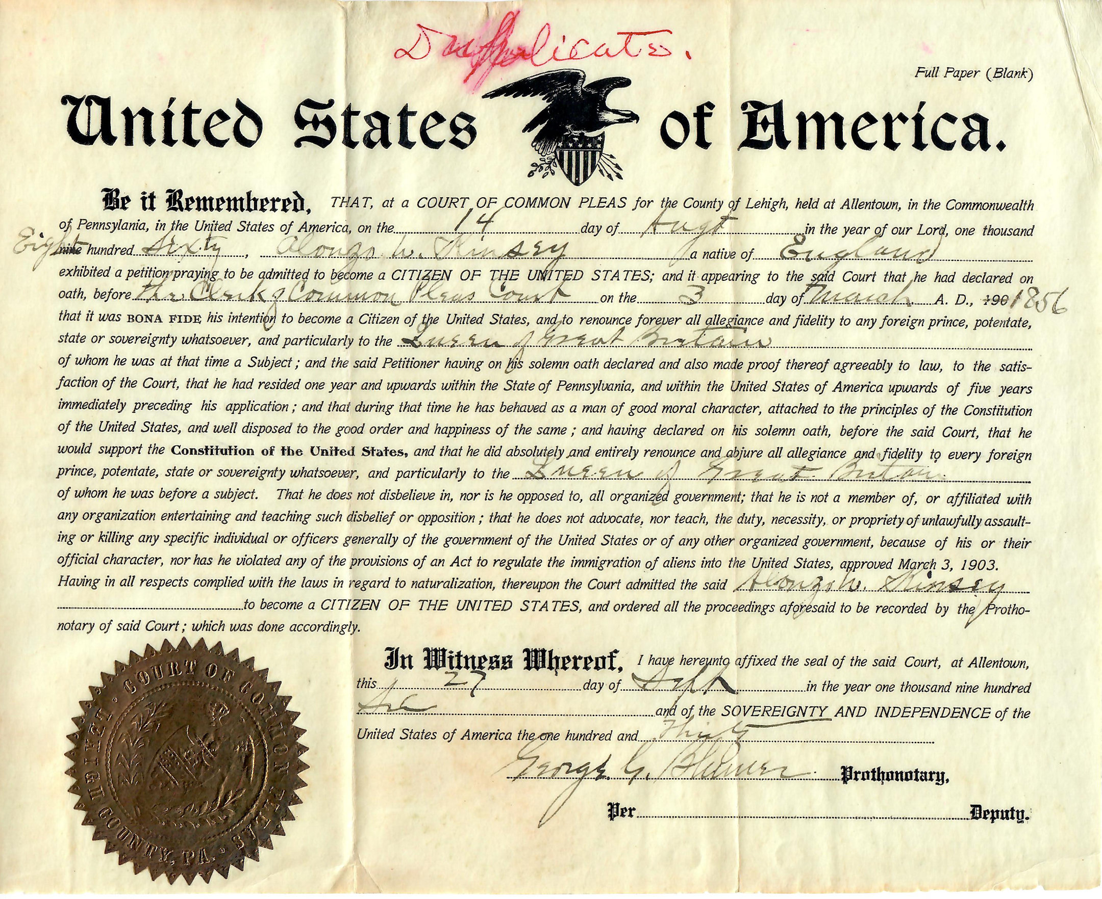 Copy of Naturalization Record for Alonzo Kinsey (14-AUG-1860)