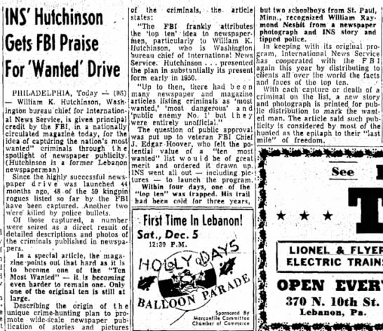 INS' Hutchinson Gets FBI Praise for 'Wanted' Drive
