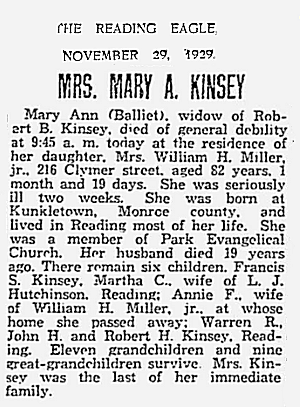 Mary Ann Balliet Kinsey Obituary 29-NOV-1929 Reading Eagle, page 2, col. 2