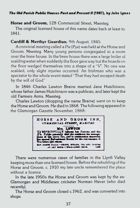 Source: The Old Parish Public Houses Past and Present II (1987), by John Lyons • Image Detail: Image 37 of 114 • Horse & Groom, 128 Commercial St., Maesteg, Wales • Page 37, 51 (photo), 99, & 114 • https://archive.org/details/oldparishpublich0000john/page/37/mode/1up